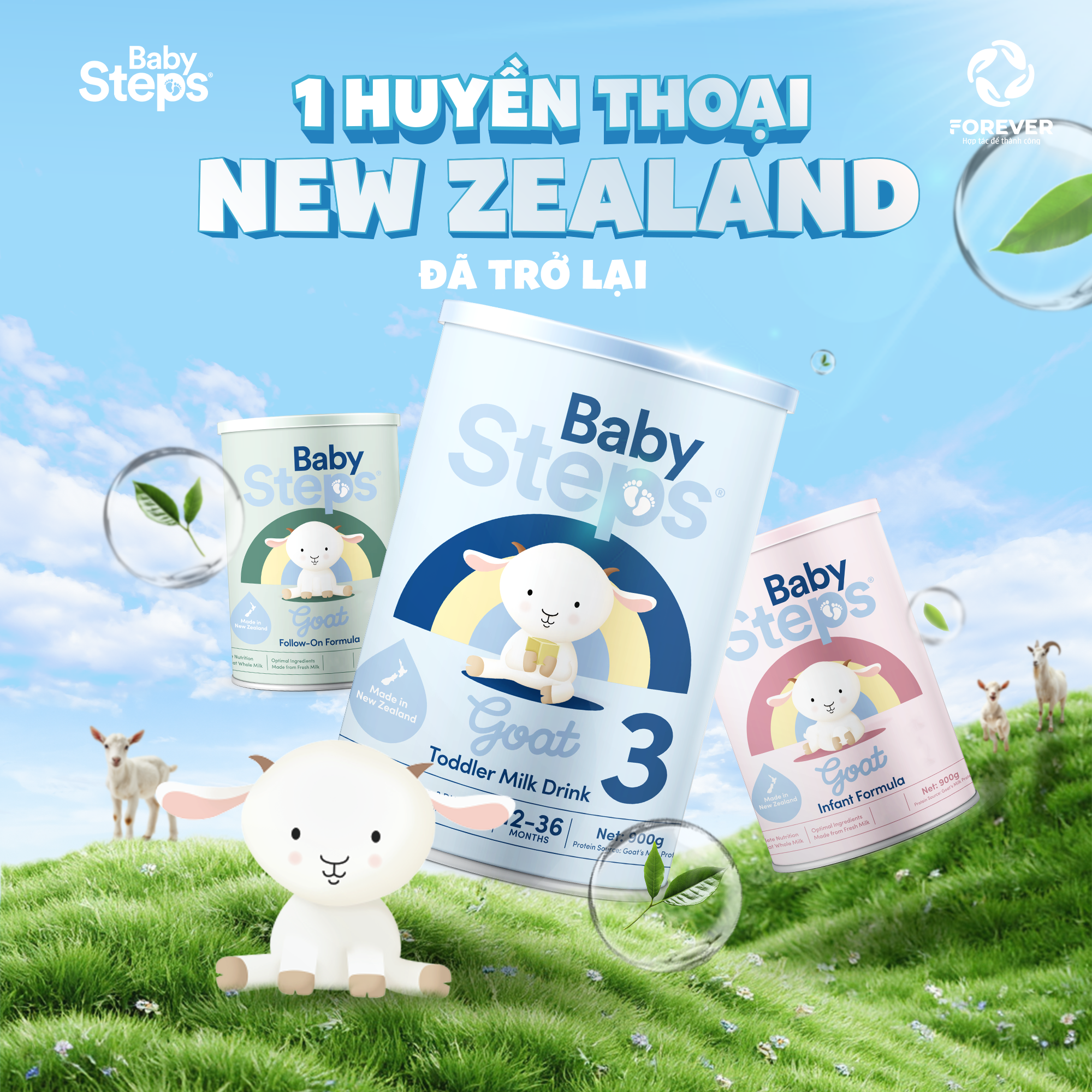 Baby Steps (New Zealand) – Thương hiệu sữa dê 7HMO bán chạy số 1 New Zealand, sản xuất từ sữa tươi nguyên kem với chuỗi cung ứng khép kín “từ trang trại đến lon sữa”.