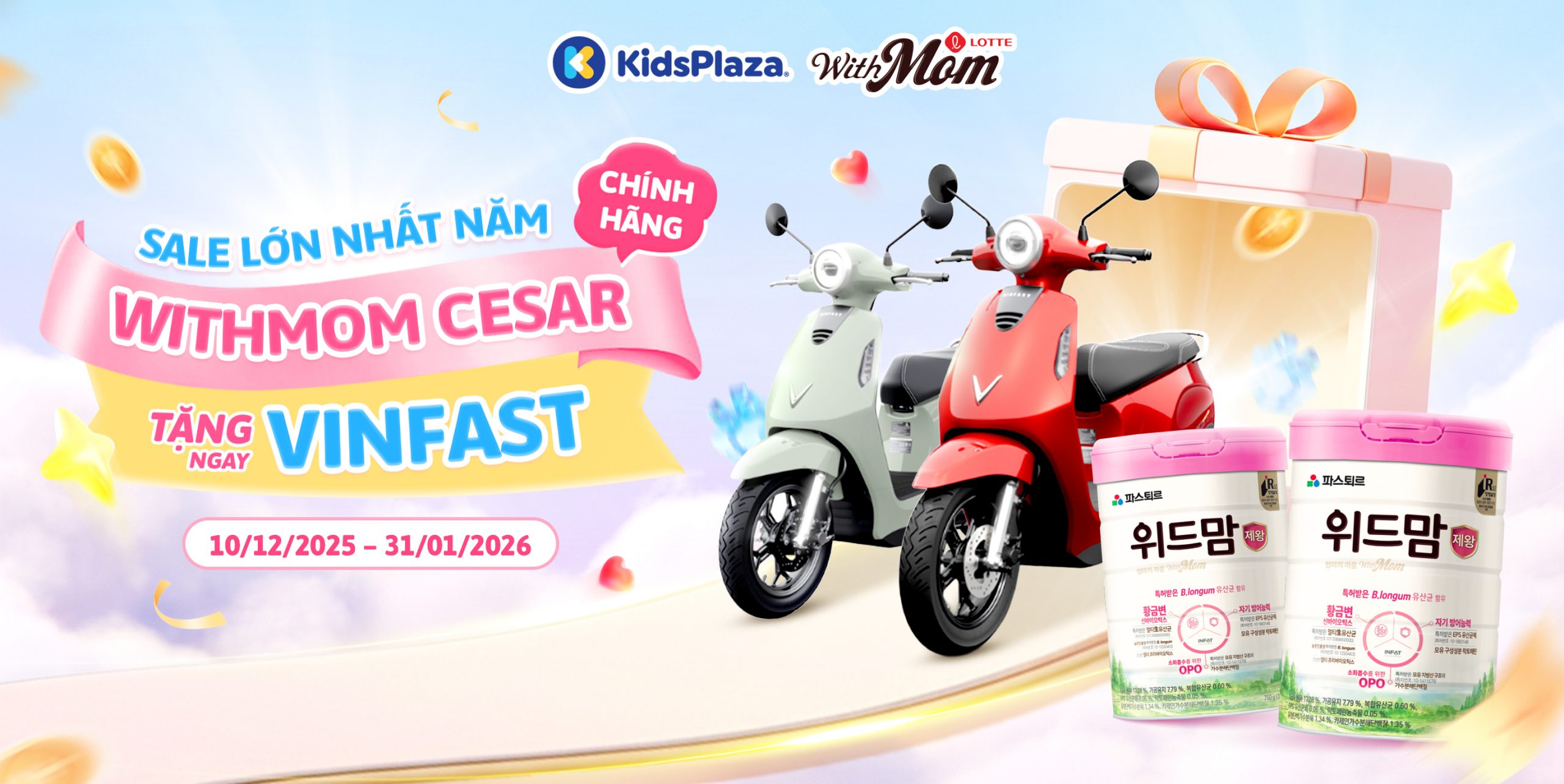 Và đặc biệt, khi mua Withmom Cesar chính hãng trong chương trình “Tã sữa chính hãng – Tặng ngay VinFast” tại KidsPlaza, mẹ sẽ nhận ưu đãi hấp dẫn, cơ hội trúng xe máy điện VinFast có giá trị lên đến 21.000.000đ. Vừa chọn sữa chuẩn cho bé, vừa săn quà lớn đón Tết – quá hời luôn mẹ ơi!
