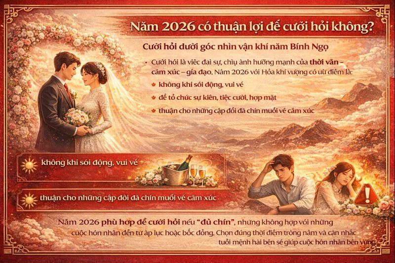 Cưới hỏi là việc đại sự, chịu ảnh hưởng mạnh của thời vận – cảm xúc – gia đạo. Năm 2026 với Hỏa khí vượng có ưu điểm là: