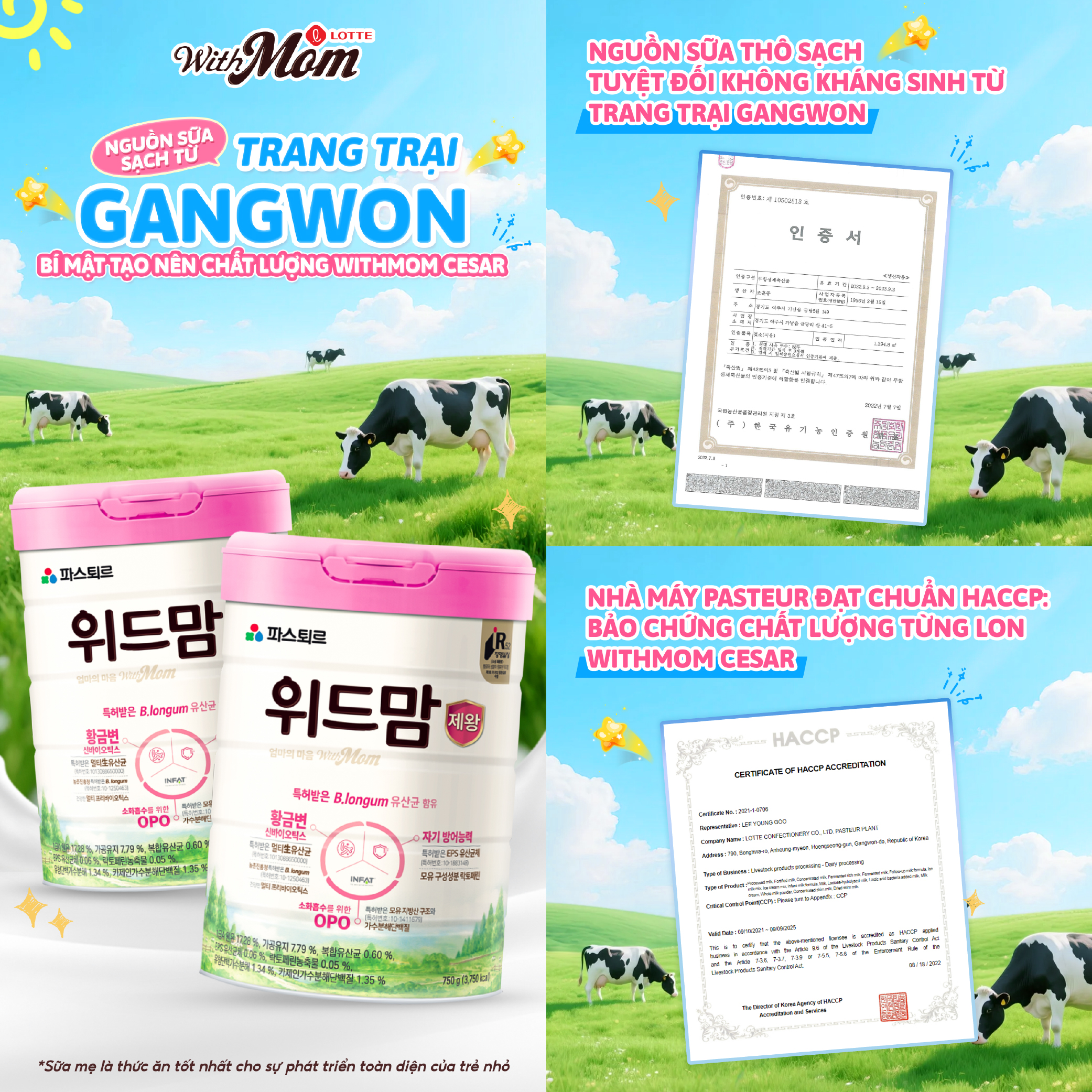 Nguồn sữa thô của Withmom Cesar đạt chứng nhận Không Kháng Sinh do Cục Quản lý Chất lượng Sản phẩm Nông nghiệp Quốc gia Hàn Quốc (NAQS) kiểm định, đảm bảo tinh khiết và giàu dưỡng chất trước khi đưa vào sản xuất. Từng lon sữa được chế biến tại nhà máy Pasteur của Lotte, nơi ứng dụng dây chuyền khép kín và đạt chuẩn HACCP, trải qua các bước kiểm định chất lượng nghiêm ngặt về vi sinh, độ tinh khiết và độ đồng nhất của sản phẩm. Hệ thống quản lý truy xuất nguồn gốc được vận hành chặt chẽ, giúp mọi thông tin về sản phẩm luôn minh bạch và xác thực.