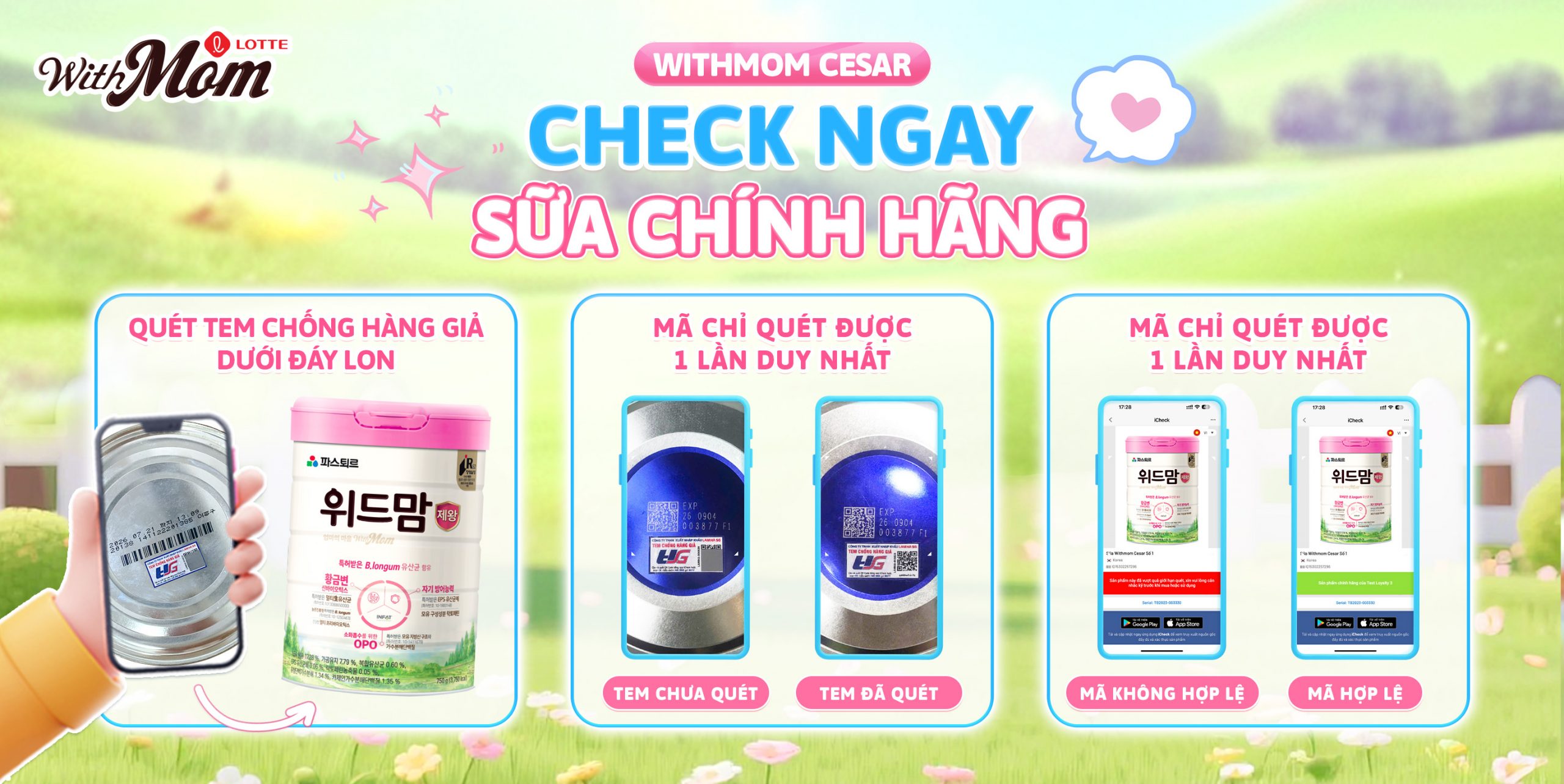 Để đảm bảo bé đang dùng đúng sữa Withmom Cesar nhập khẩu chính ngạch, mẹ nên kiểm tra 3 dấu hiệu nhận diện do Công ty Lam Hà SG – đơn vị phân phối chính thức – khuyến nghị sau đây: