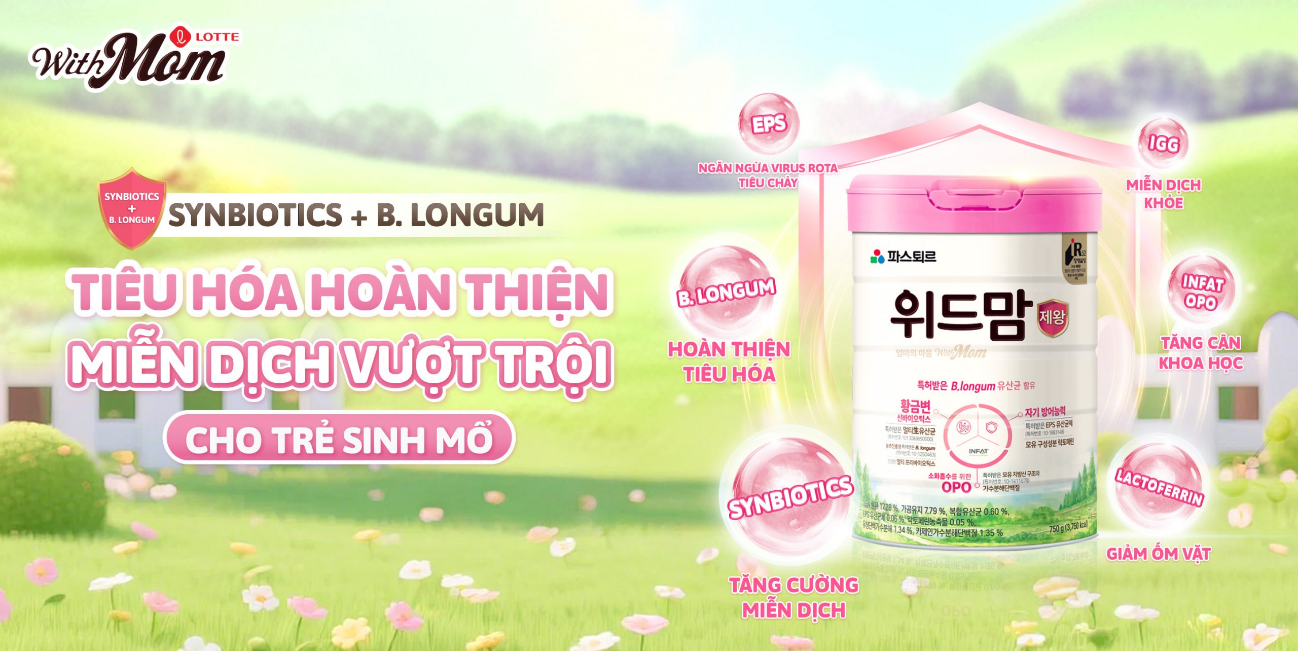 Hành trình chăm sóc và nuôi dưỡng bé yêu đôi khi đầy thử thách, nhưng Withmom Cesar sẽ là luôn người bạn đồng hành đáng tin cậy của mẹ. Với 5 bằng sáng chế độc quyền cùng dưỡng chất vàng Synbiotics + B. longum, Withmom Cesar không chỉ hỗ trợ tiêu hóa mượt mà mà còn tăng cường miễn dịch, giúp bé phát triển khỏe mạnh, ăn ngon, ngủ yên và tự tin khám phá thế giới mỗi ngày.