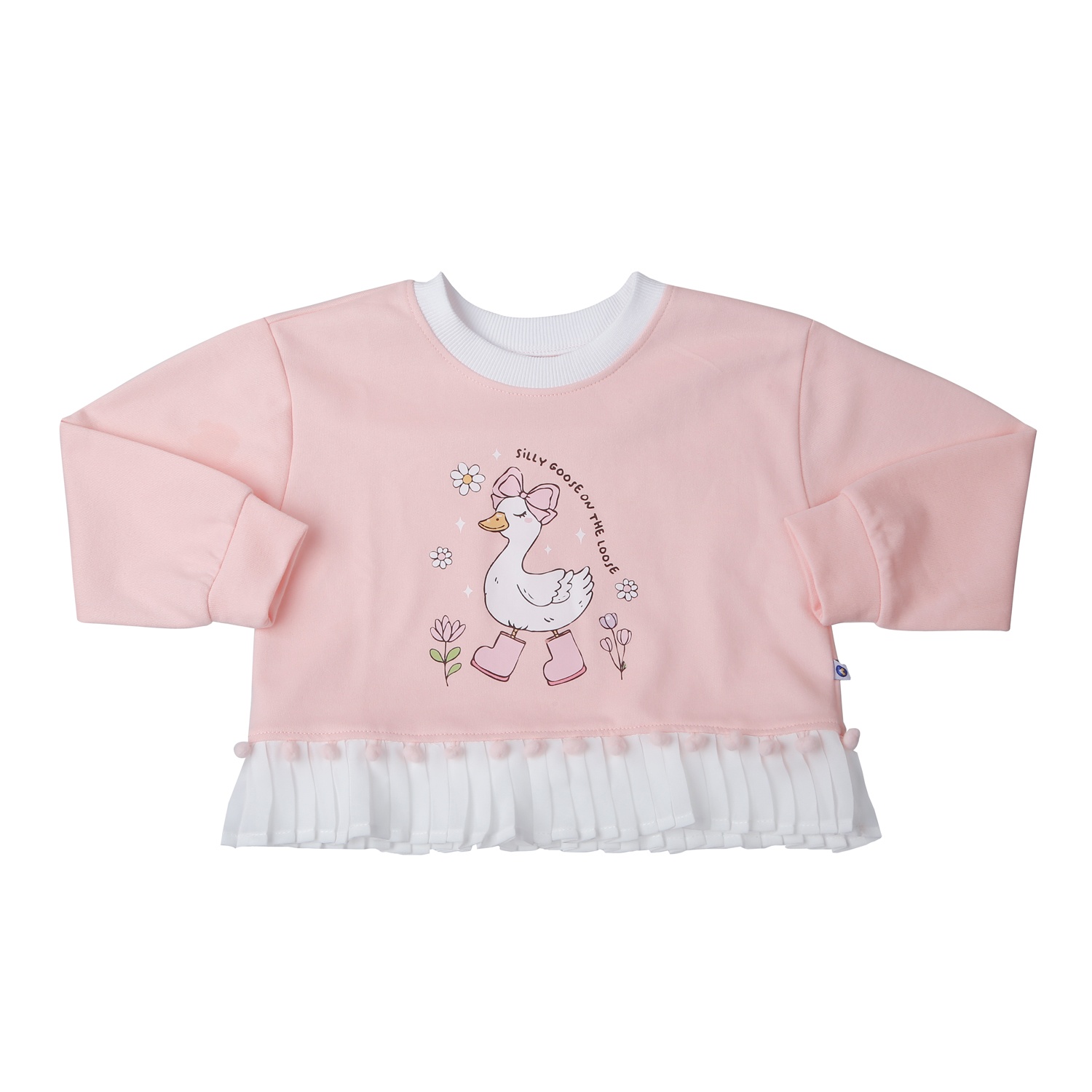 Thiết kế áo bo tay mềm mại, điểm nhấn là phần bèo xếp ly phối bi độc đáo ở gấu áo và ống quần, tạo nên tổng thể vừa điệu đà vừa tinh tế. Họa tiết vịt đi ủng ngộ nghĩnh kết hợp sắc màu nhẹ nhàng giúp bé trông nổi bật mà vẫn giữ được nét hồn nhiên.