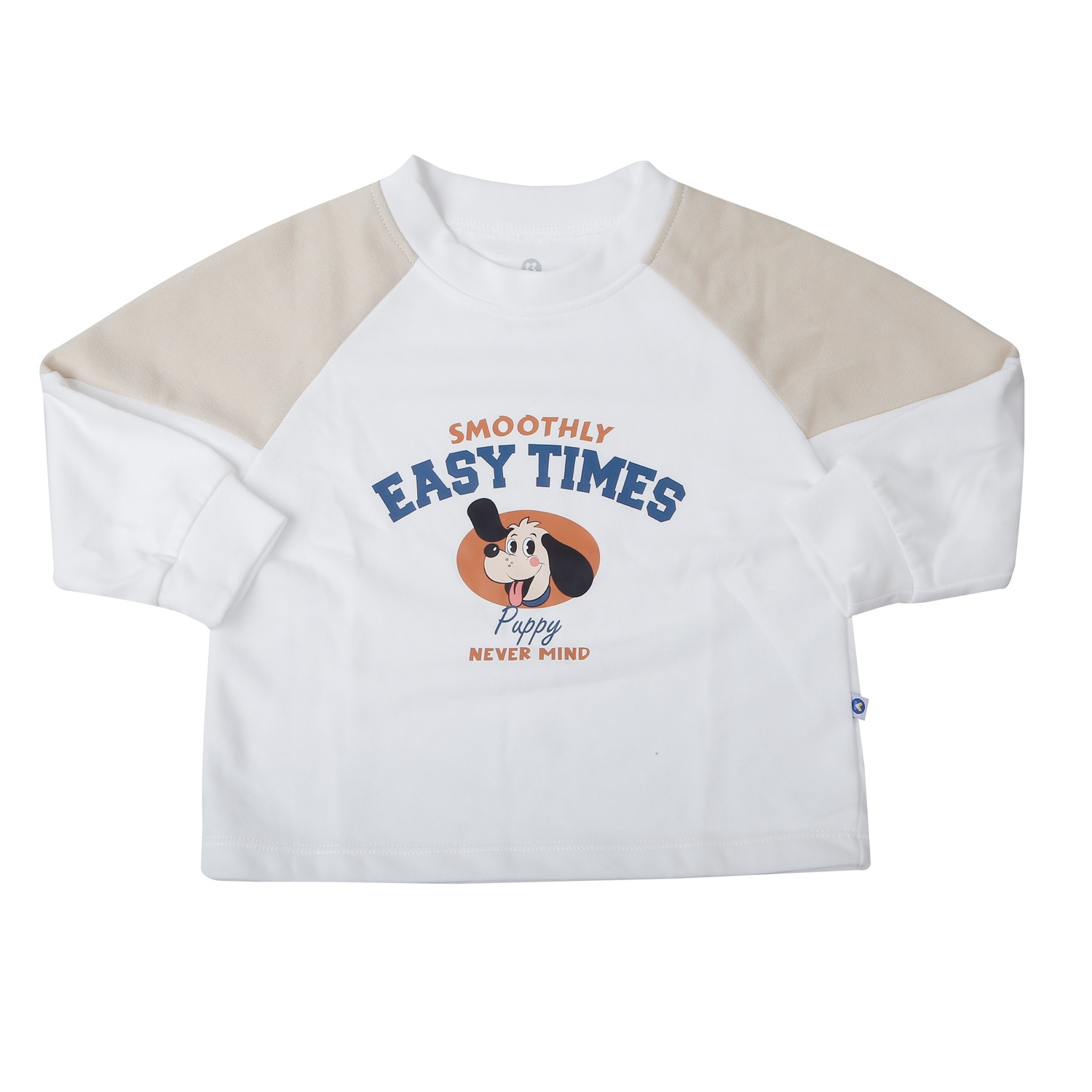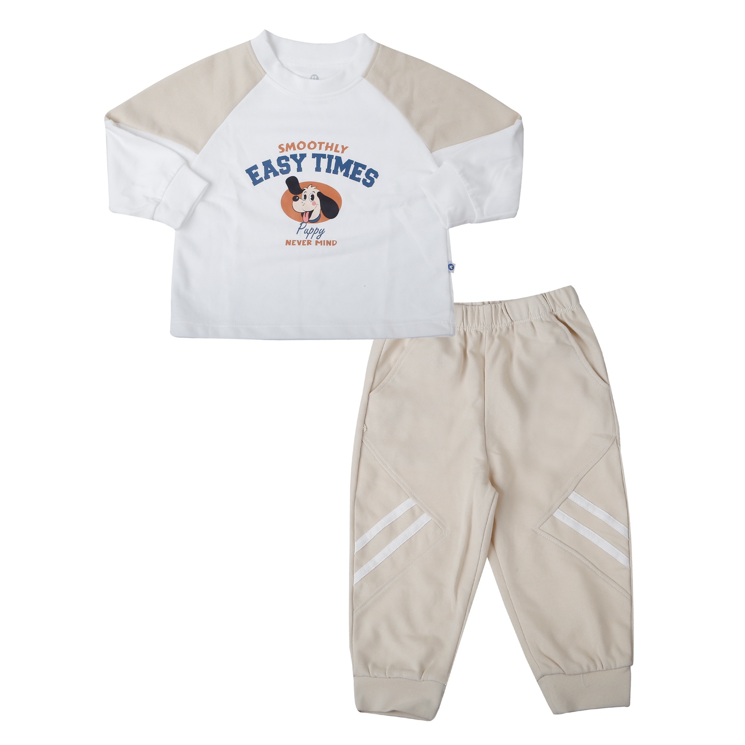 Áo tay dài in hình chú cún ngộ nghĩnh kết hợp cùng quần dài bo gấu tông be nhã nhặn, tạo cảm giác hài hòa và thời trang.