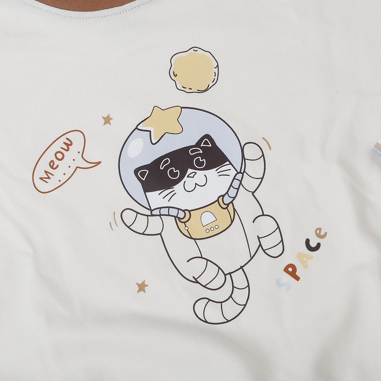 Bộ đồ bé trai KidsPlaz mèo vũ trụ HN25D (Nâu be) họa tiết mèo phi hành gia mang đến vẻ ngoài năng động và đáng yêu cho bé.