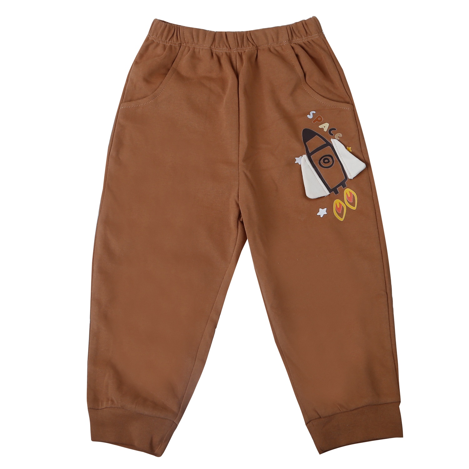 Quần dài màu nâu trầm phối họa tiết tên lửa tinh nghịch, tạo nên tổng thể hài hòa, bắt mắt.
