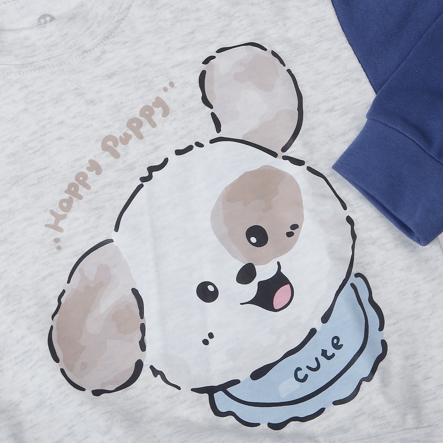 Áo tay dài phối màu xám – xanh hiện đại, nổi bật với hình “Happy Puppy” dễ thương, mang lại vẻ ngoài tươi sáng, vui nhộn cho bé.