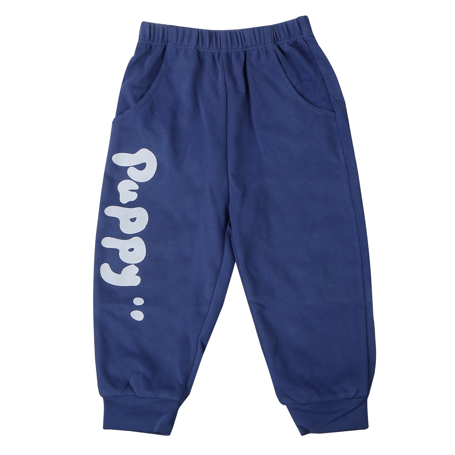 Quần dài bo gấu in chữ “Puppy” nổi bật, lưng thun co giãn linh hoạt giúp bé thoải mái vận động suốt cả ngày.