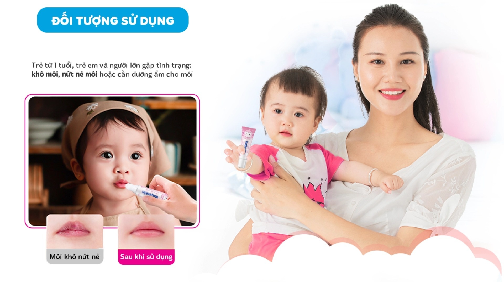 Dùng cho trẻ Trẻ từ 1 tuổi, trẻ em và người lớn gặp tình trạng khô môi, nứt nẻ môi hoặc cần dưỡng ẩm cho môi.