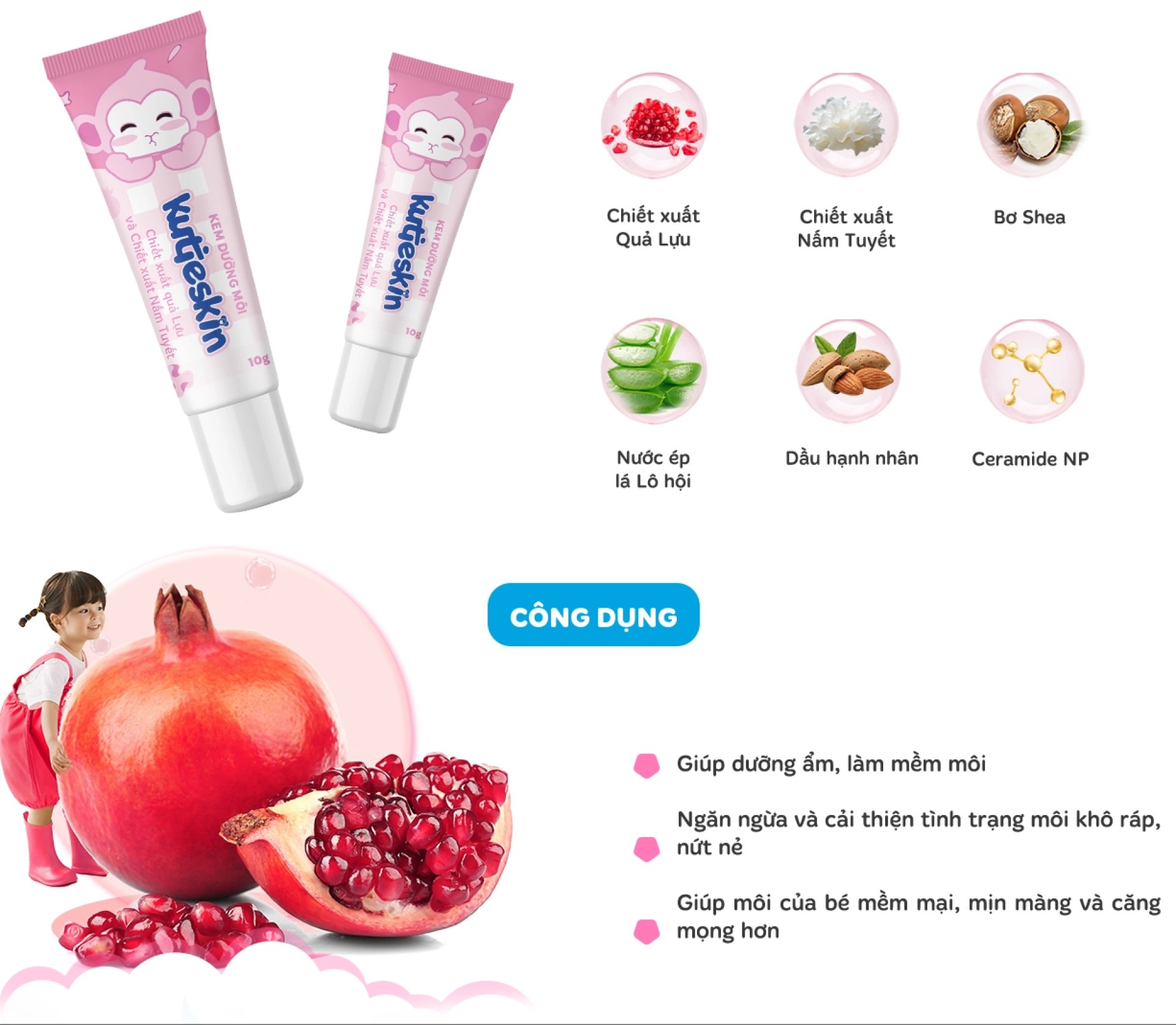 Kem dưỡng môi cho bé Kutieskin giúp đôi môi của bé mềm mại, mịn màng và căng mọng hơn. Tuýp xinh xắn, dễ sử dụng và tiện lợi mang theo cho bé.