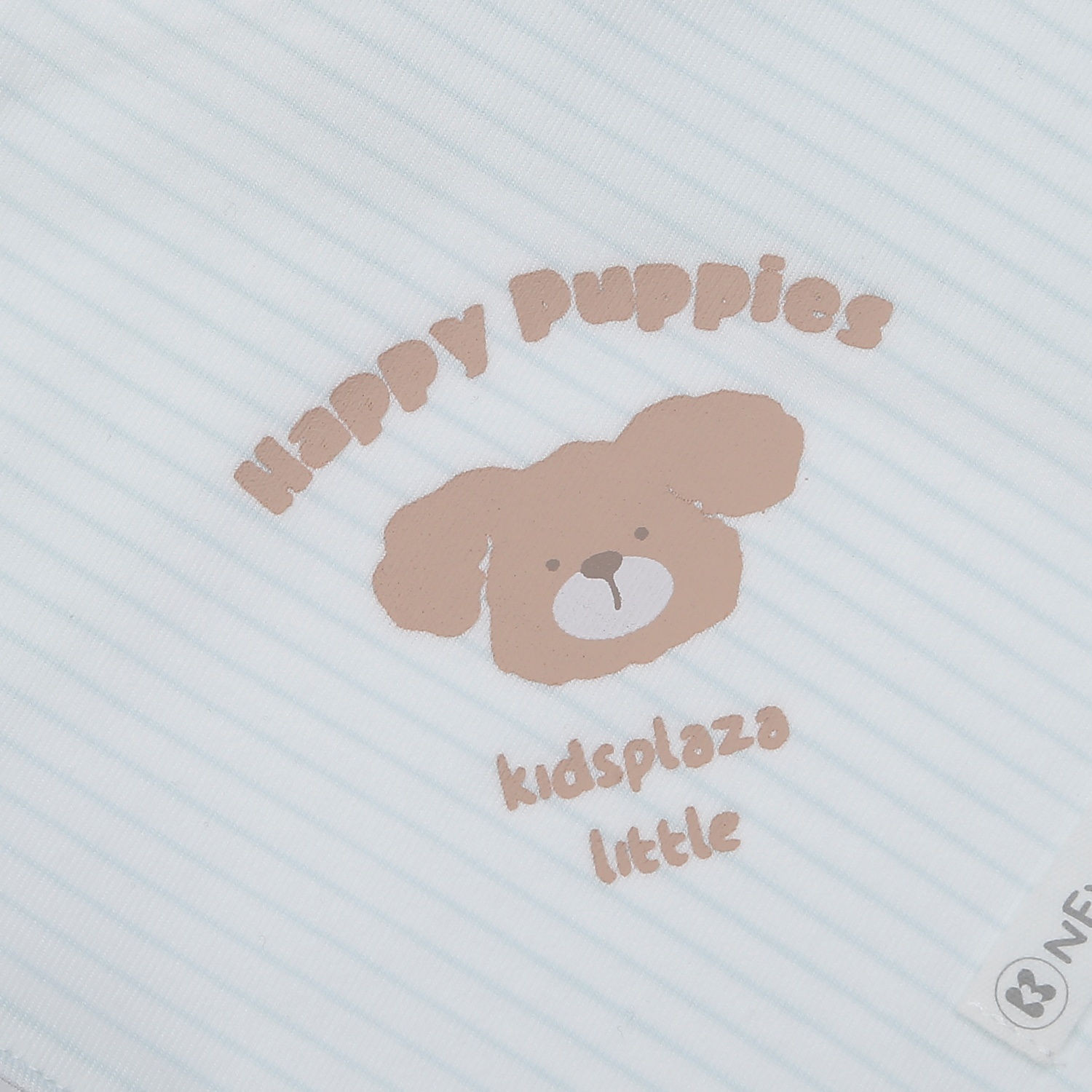 Yếm có họa tiết xinh xắn với hình ảnh chú cún và dòng chữ "Happy Puppies - KidsPlaza Little", phù hợp với phong cách đáng yêu của các bé, giúp bé trở nên thời trang hơn.