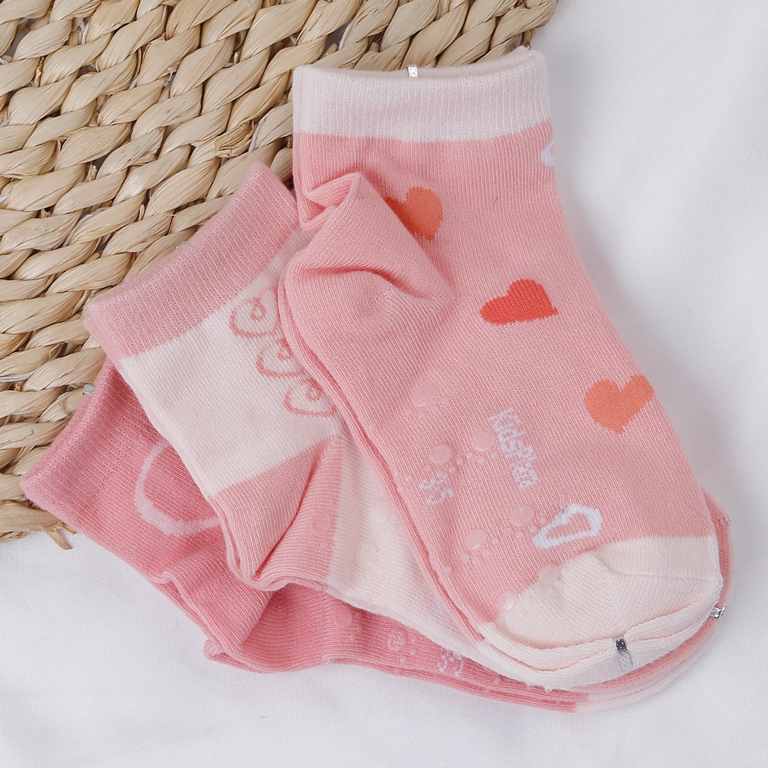 Thiết kế màu hồng ngọt ngào kết hợp họa tiết trái tim dễ thương giúp đôi tất thêm nổi bật và phù hợp cho bé gái. Phần đế được trang bị hạt chống trượt an toàn, hỗ trợ bé vững vàng hơn khi tập đi hay vui chơi.